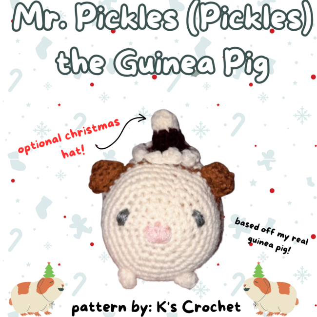 Mr. Pickles the Guinea Pig is an Intermediate Crochet pattern designed by K's Crochet for making an Amigurumi. Mr. Pickles the Guinea Pig is a quick 45 minute-1 hour make, so he is perfect for market prep! He is the cutest little (non-mess making) pet for everyone, especially littles! If you have any questions at all please message me here on ribblr or o...