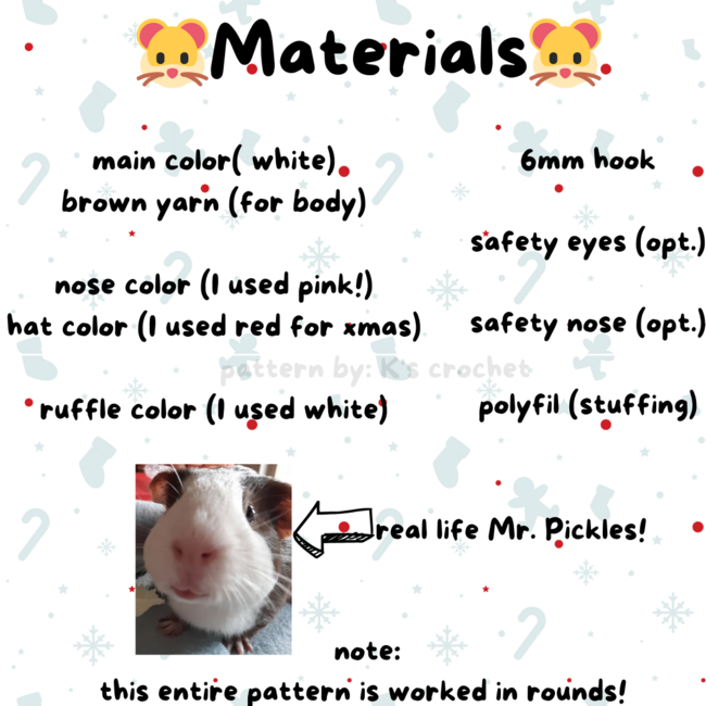 To make Mr. Pickles the Guinea Pig you will need: white yarn, brown yarn, safety eyes, darning needle, stuffing, 6 mm hook.