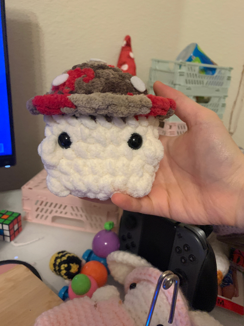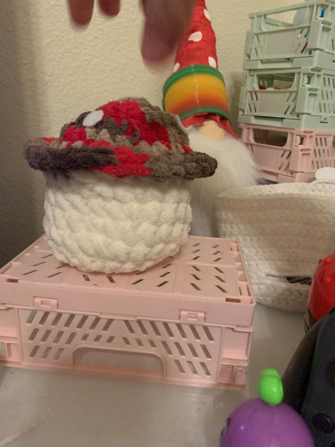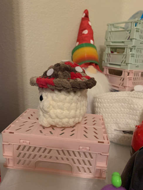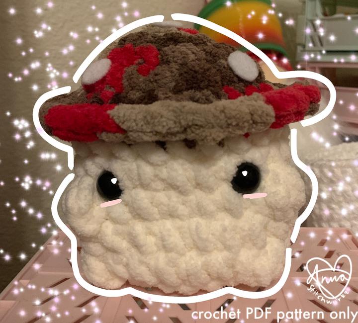 Crochet your very own Mushroom Man! He works up in about 30-45 minutes. Includes detailed and easy to read instructions. It is a ZERO-SEW pattern with no visible color switches!. I used Bernat Blanket yarn for mine.