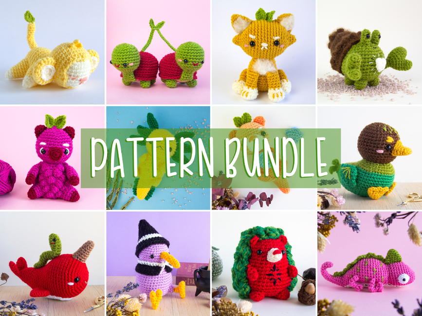 The Crochet Pattern Bundle includes 12 patterns, featuring the following creatures from the Fruity Animals collection: