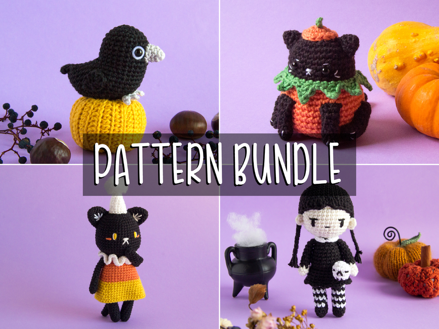 My Halloween Friends bundle includes the patterns for Autumn Raven, Pumpkin Kitty, Spooky Girl, and Candy the Cat.