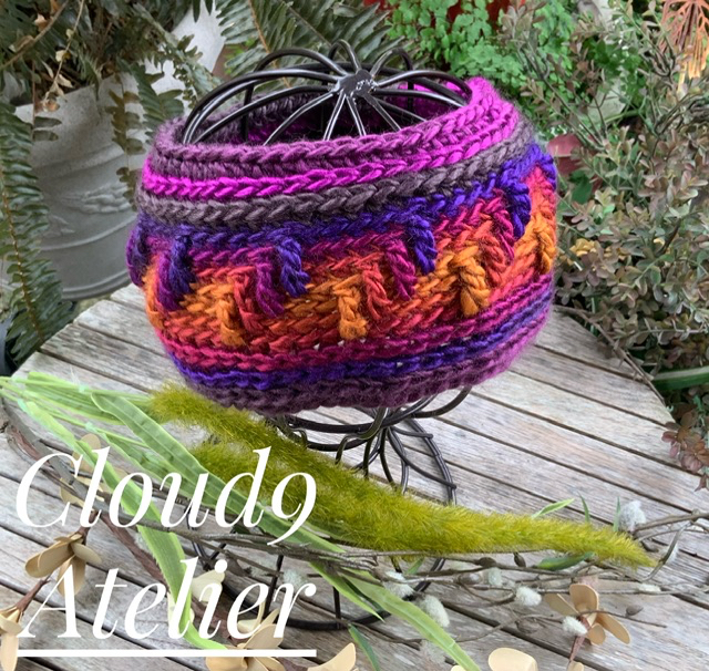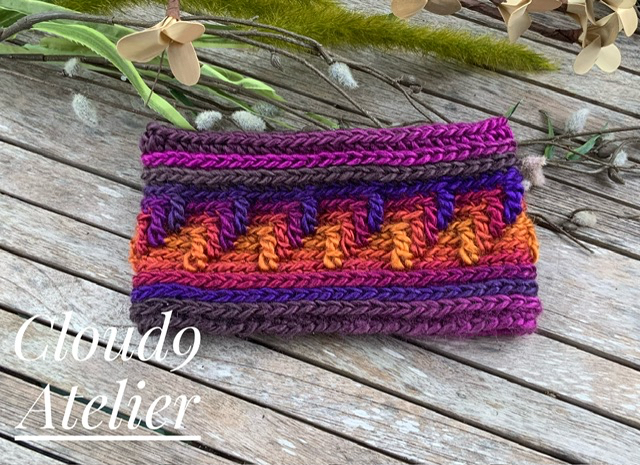 If you like interesting texture, this headband is for you. It's worked in the round which means there is no sewing and only 2 ends to weave in. Self-striping yarn is heaven sent as it adds a layer of colorful interest. The design is a variation of the Apache Tears stitch and a companion to the Native Tears Cowl.