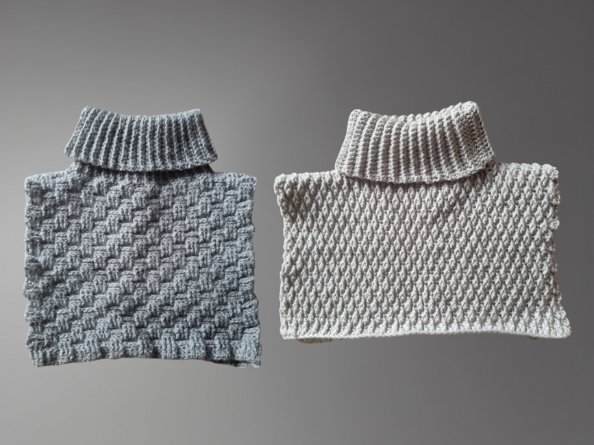 This bundle includes two crochet neck warmers. The patterns are intermediate and you should be familiar with front/back post double crochet stitches.