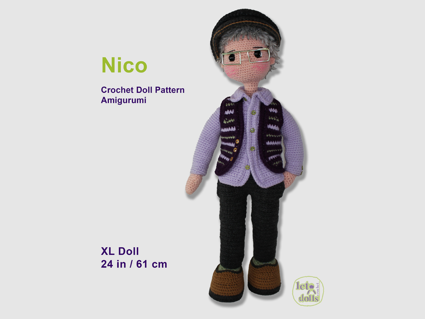 Create Nico, a charming crochet doll! This amigurumi pattern will guide you step by step to make a 24" XL doll with detailed clothing and accessories.