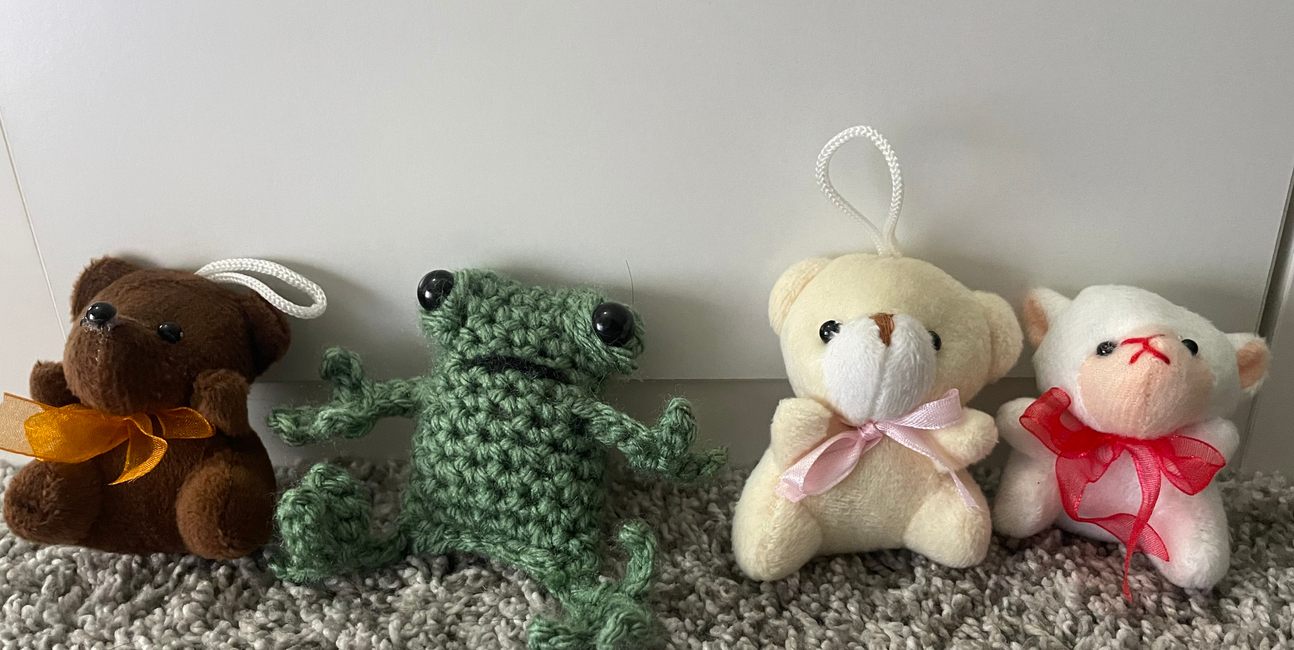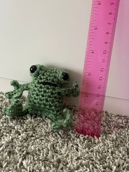 To make No Sew Baby Leggy Froggo (Free!) you will need: Black yarn to embroider the face!, color for the froggy, Stuffing to stuff the frog., Safety eyes for froggy eyes.. Tools required: I used a 4.25 mm hook, but use whatever matches the yarn you@qre using. For best *mini* results, use a 4.25 mm hook or less with acrylic yarn., This is used to embroider the mouth., scissors!.