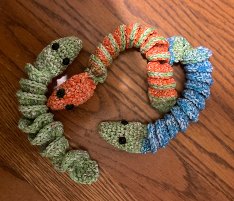 This silly slithering snake is just fun. She is small enough to keep in a pocket, wiggly enough to play with, and flexible enough for nervous fingers!