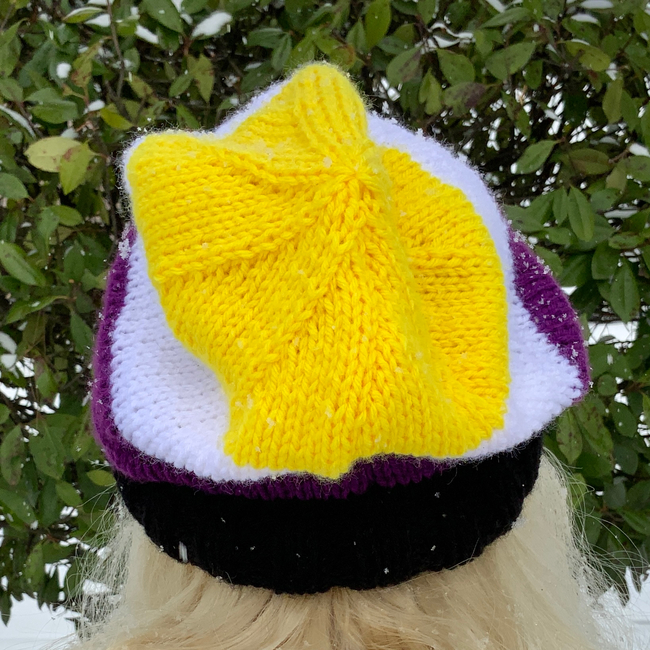 Show your pride with this simple yet stylish slouchy beanie! Worked flat with stockinette stitch and ribbing, it is a great pattern for beginners looking to branch out with some new techniques.