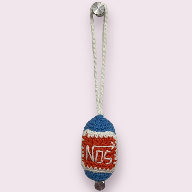 A small amigurumi style car charm to hang from a rearview mirror. This charm is designed to look like a Nitrous Oxide cannister (NOS), which is used in cars to give a speed boost.
