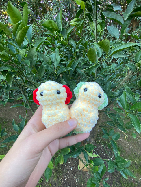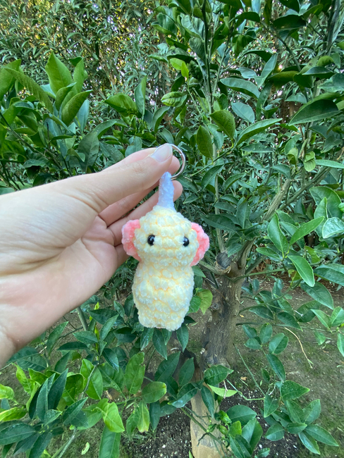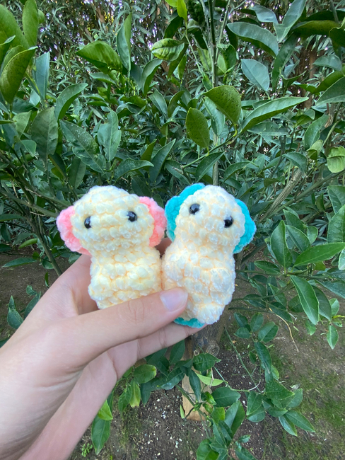 This is a pattern for a keychain chubby axolotl (mini), I used a 3.5mm hook (but you can use any) and 8mm eyes. For this pattern, you need 2 colours of yarn (1 for the body and 1 for the gills & tail).