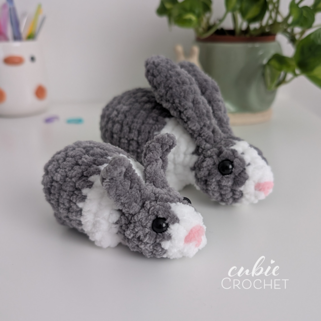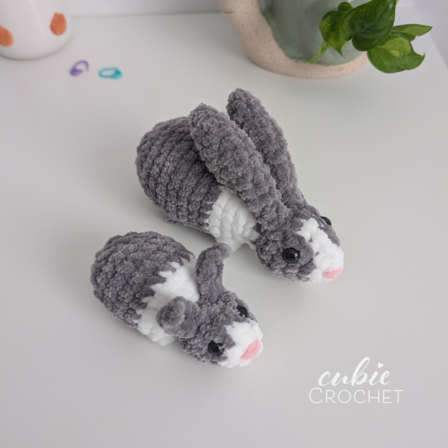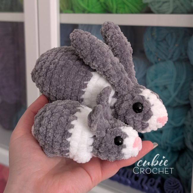 Both these patterns are no-sew. The larger bunny's ears are made first, then joined while crocheting. The smaller bunny is made entirely in one piece.
