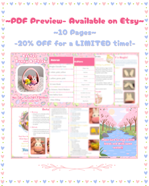 This pattern includes many detailed instructions and images on how to make both the Bunny Version and the Chick Version . Please read all the provided instructions carefully and don't forget to take a break every now and then! <3
