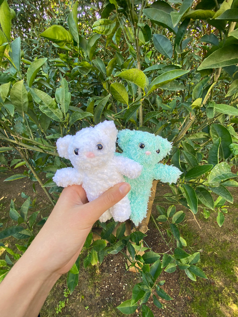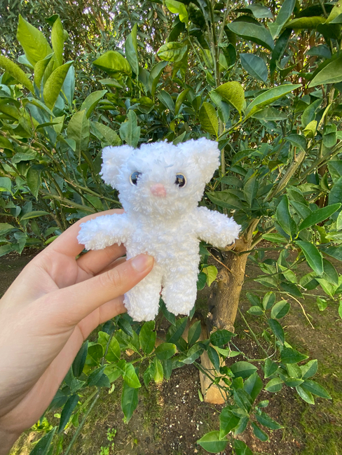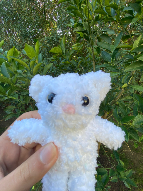 This is a pattern for a small fluffy kitten (pocket sized), I used a 3.5mm hook (but you can use any) and clear 10mm eyes. For this pattern, you need 2 colours of yarn (1 for the body and 1 to embroider the nose).