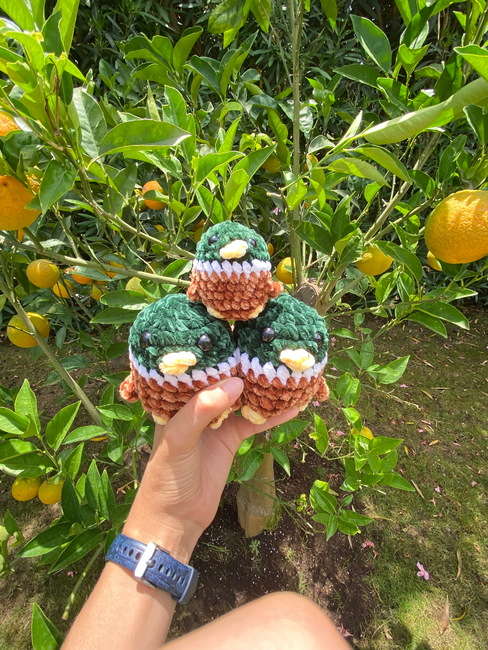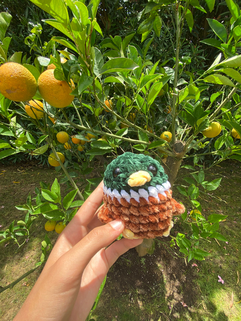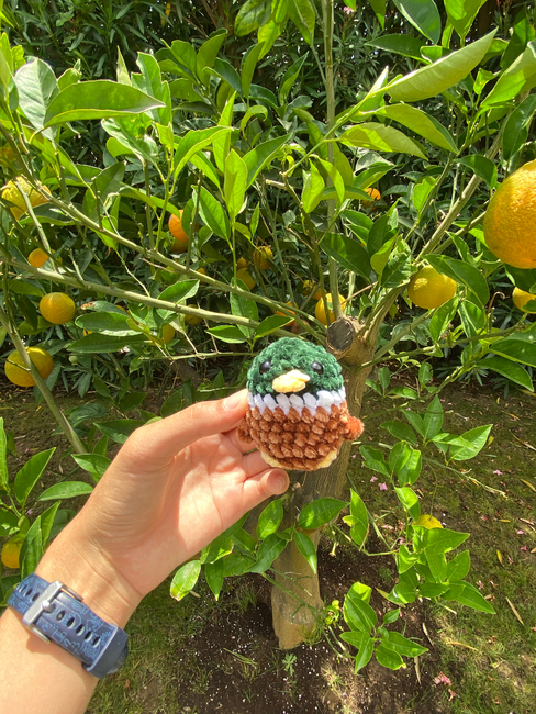 This is a pattern for a keychain mallard duckk (mini), I used a 3.5mm and 7mm hook (but you can use any) and 8mm or 12mm eyes. For this pattern, you need 4 colours of yarn (green, brown, white and yellow).