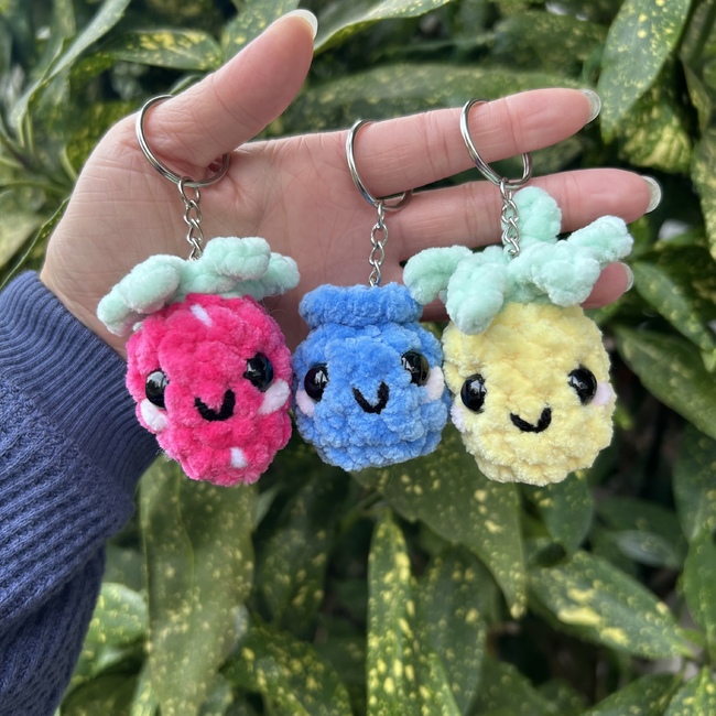 This is a simple no-sew pattern to make a mini pineapple, strawberry, or blueberry! These little cuties are perfect for keychains and other accessories, or even just on their own