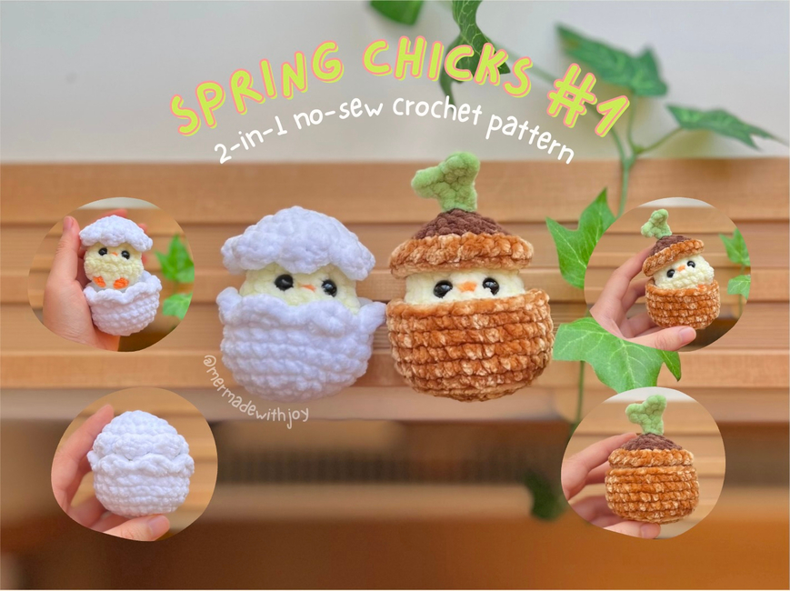 No-Sew Spring Chicks #1 | Egg and Sprout is a Beginner Crochet pattern designed by Mer-made With Joy for making an Amigurumi. This is a 2-in-1 no-sew crochet pattern for making an egg and sprout chick! This is the first of three spring-themed chick bundles in my shop! The chick with an egg hat comes with a separate egg shell, and the chick with a sprout hat comes with a ...