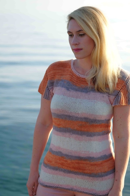 To make Oh-pa Top 2449 you will need: ©Knit One Crochet too Yarn2nd Time Cotton (aran)(100 gr/180 yds/165 m),75% Recycled Cotton, 25% AcrylicMain Color: #205 Bermuda 3 (4, 4, 5, 5) skeins, OR: ©Knit One Crochet too YarnTY-DY Cotton (worsted)(100 gr/196-yd/179-m), 100% CottonMain Color: Sunset 3 (4, 4, 5, 5) Skeins, Tapestry Needle, Stitch markers 2 different colors. Tools required: For aran weight: Size 8 (5 mm) circular needles 24@Q & 16@Q or size to obtain gauge., For worsted weight: Size 10 (6 mm) circular needles 24@Q & 16@Q or size to obtain gauge., 1 extra needle for 3 needle Bind Off..