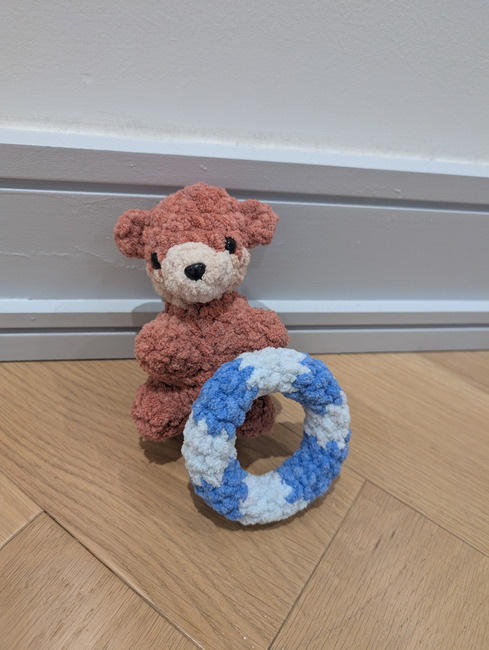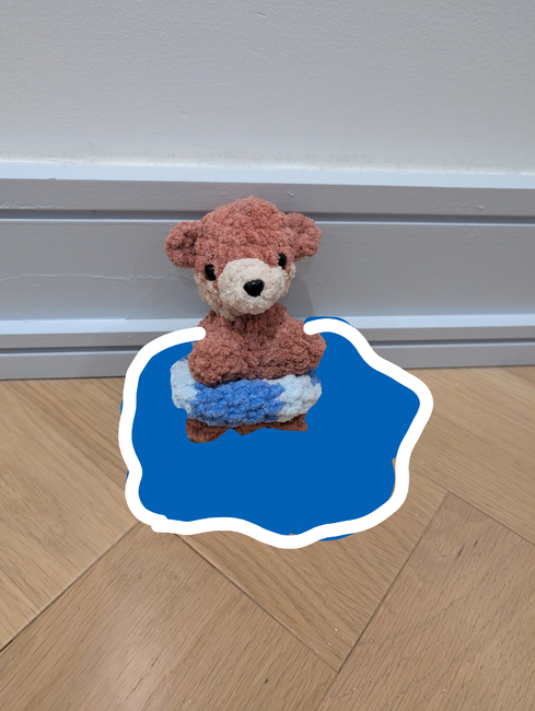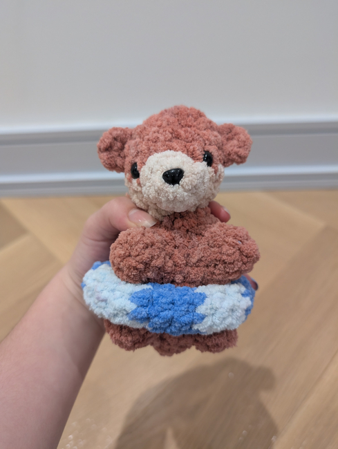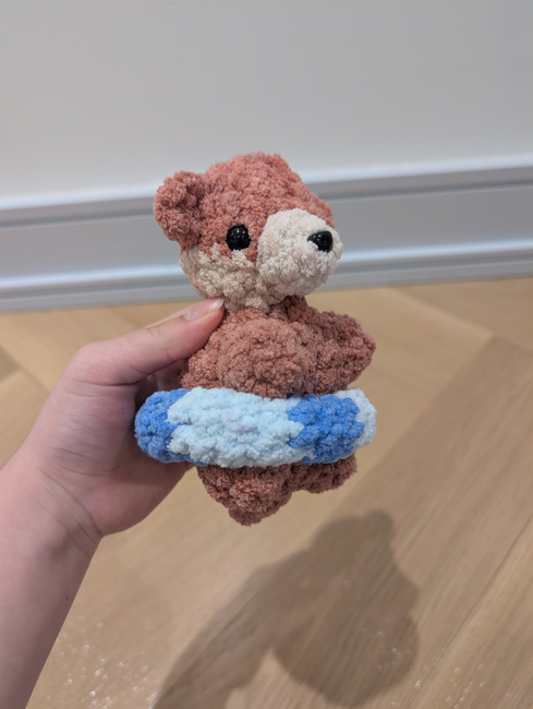 This is Oliver the otter he's a cute otter that's pretty chaotic in the water,he does need experience with sewing for his nose,ears,arms/legs and his floaty and his floaty is a removable cute accessorie