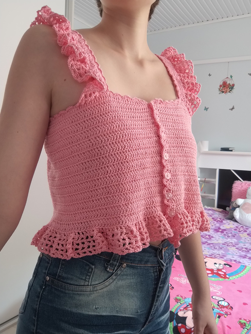 Hello! I'm Elle and this is my first pattern. It's a cute, beginner friendly, summer top, that only takes four different stitches to craft. It's a really carefree pattern and if for some reason it ends up getting to big there is no problem because we are going to use elastics on this one. Since English isn't my first language you can feel free to contact me if you don't understand some part of the pattern. I'll do my best to explain in details how to make this top, so I hope you enjoy crafting it as much as I did! And if you like it, please let me know, and consider buying my other patterns in the future!