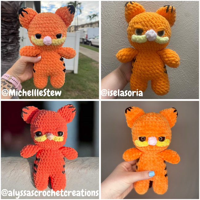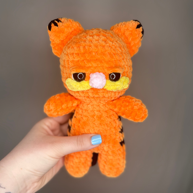 Head, body, legs, arms, ears, tail, and eyelids color (1/2 of a skein of parfait chunky by Premier Yarns in color tangerine) Stripes and ear detail color (small amount of parfait chunky by Premier Yarns in color black) Mustache color (small amount of parfait chunky by Premier Yarns in color sunshine) Nose color (small amount of parfait chunky by Premier Yarns in color cotton candy) Eye detail color (small amount of parfait chunky by Premier Yarns in color white)
