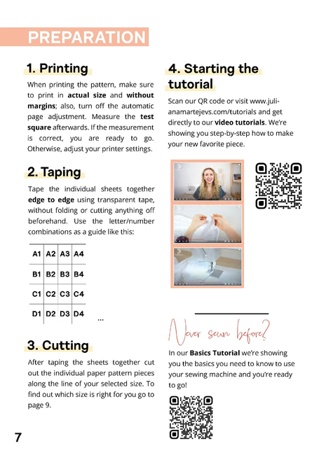 Use the video sewing instructions to the pattern and sew along step by step with Juliana. If you've never sewn before, watch the sewing machine basics video tutorial first. There you will learn about the components of a sewing machine and how to sew your first seam.