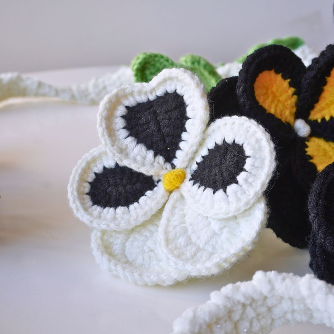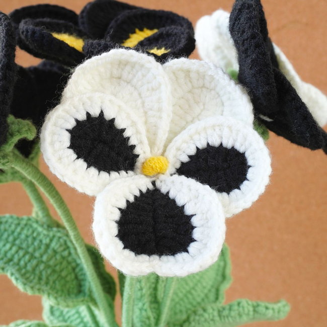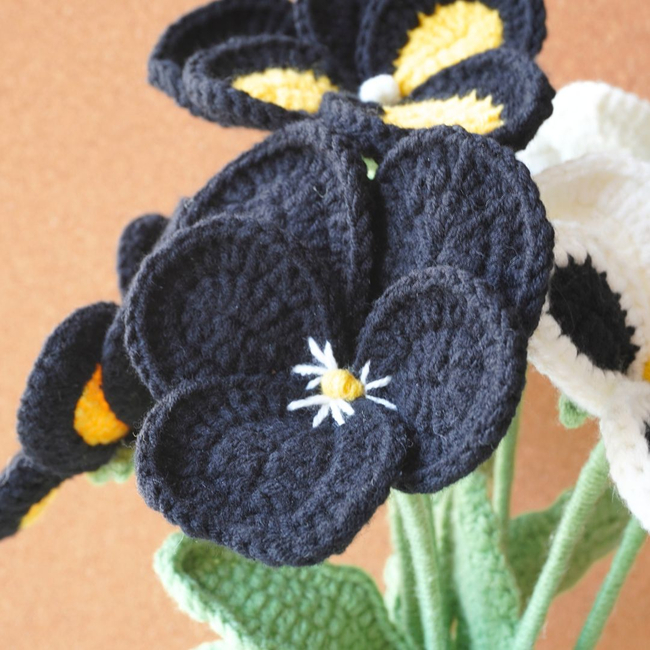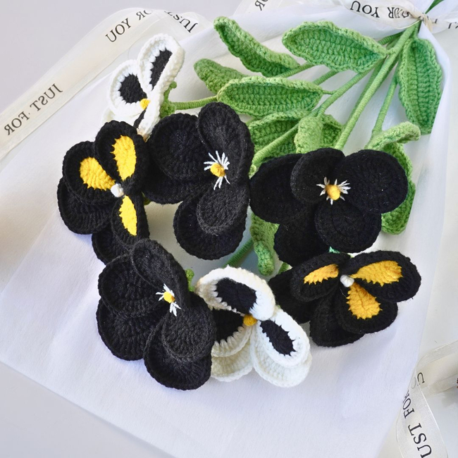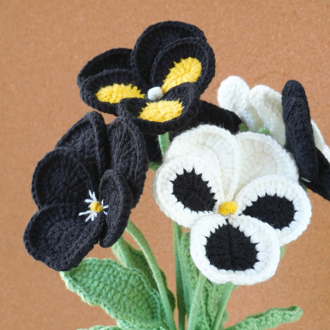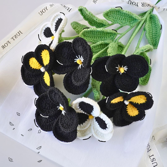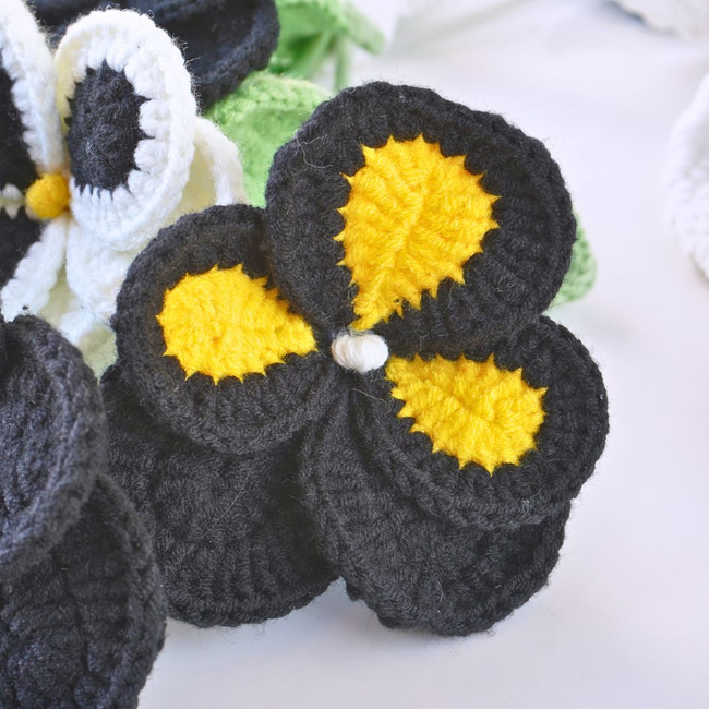 This beautiful crochet pattern features a bouquet of black and yellow pansy flowers, crafted with intricate details. The petals are delicately shaped, with contrasting black, yellow, and white colors, making each flower stand out.