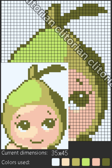 This adorable Pear Sonny Angel makes for a cute tapestry! This pattern will get you the chart/grid of the tapestry, a version with no grid, and the dimensions and color key. Can be made with any method of tapestry creation you choose, whether it be crochet, perler beads, cross-stitch or more!