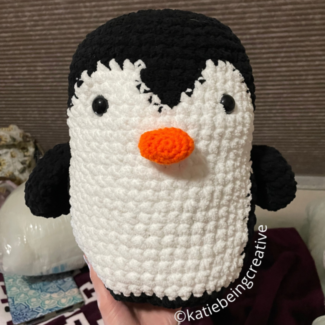 For this pattern I used: Bernat Blanket, Bernat Baby Blanket, and Big Twist Value Yarns, 8mm and 5mm crochet hooks, stuffing, yarn needle, stitch markers, and 20mm safety eyes. Any yarn weight can be used for this pattern, just note that it will change the overall size of the penguin since it is designed to be made with a larger yarn like weight 6 yarn for the body and wings and a weight 4 yarn for the beak. Any size safety eyes will also work, but I do think 20mm or bigger is the cutest :).