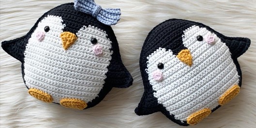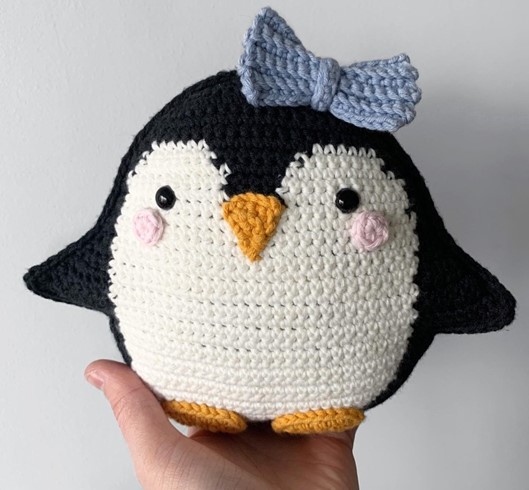 White Colour DK Weight Yarn Black Colour DK Weight Yarn Any Colour DK Weight Yarn (for bow) Yellow/ Mustard Colour DK Weight Yarn (for beak and fee) Pink Colour DK Weight Yarn (for cheeks)
