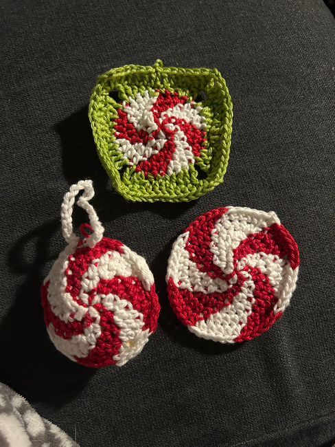 Here is a peppermint pattern. You can use this to make a ornament, pillow, coaster, or granny square! The possibilities are endless!