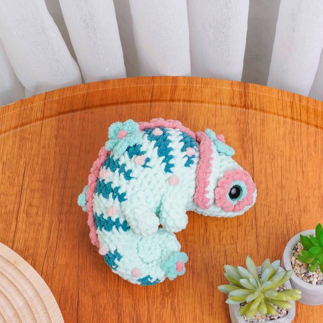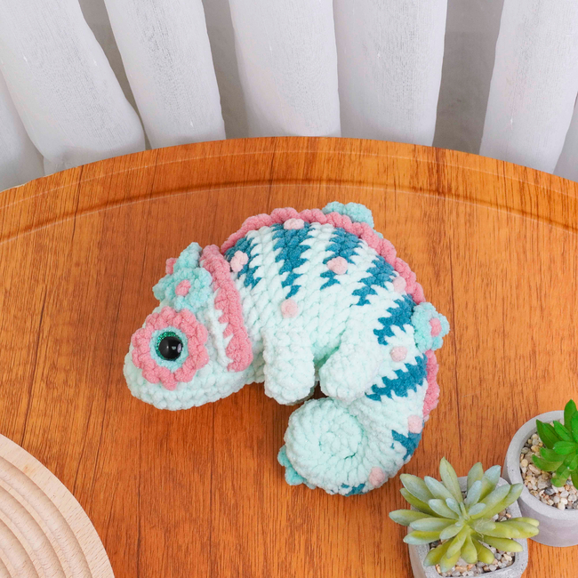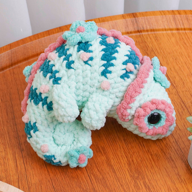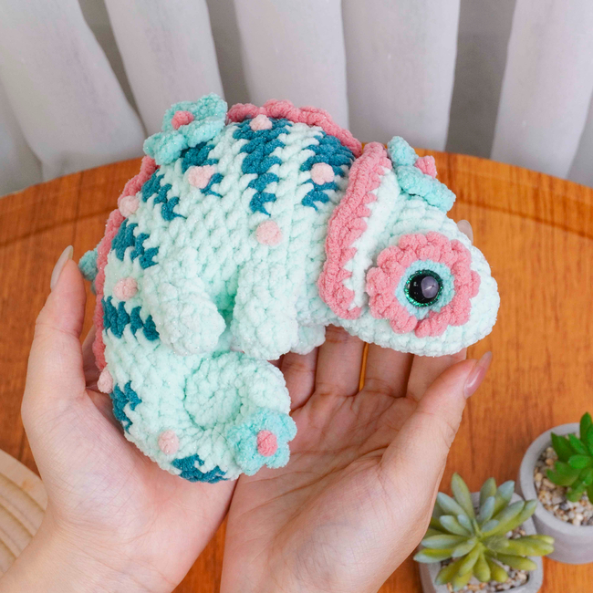 To make Periwinkle Gecko Crochet Pattern you will need: Color: Teal, mint, dark green, baby pink, baby pink, and cream pink, Sewing needle Scissors Fiberfill Plastic safety eyes 14mm x2. Tools required: 4.5mm.