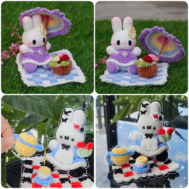 Hi! Welcome to Picnic Bunny pattern! This pattern is highly customizable since you can make any plants you wish, change the colours and patterns, and the hats from my Bunny Friends pattern also fit the Picnic Bunny! All the hats are removable! This is the third pattern from my Spring Bunnies Collection, which might end up being my favourite since I love bunnies so much!