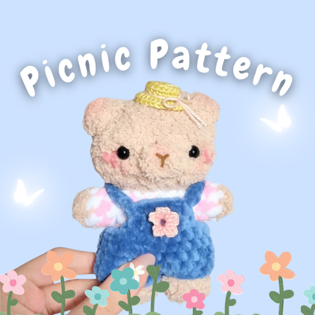 Hi! Welcome to the Picnic Ready Bear pattern, my first Lake-Side picnic themed pattern themed pattern for the month of August! This is a beginner friendly to intermediate pattern, the most difficult part being the gluing of the details onto the plushie and the sewing.
