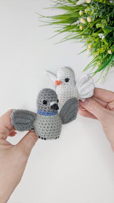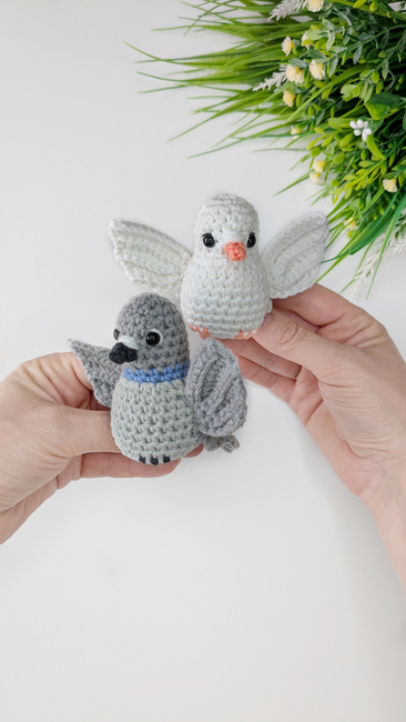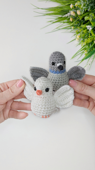 This pigeon 2 in 1 crochet pattern is an easy and fast crochet project. Using this pattern, you can crochet 2 amigurumi birds: a curious little pigeon and an elegant white dove.