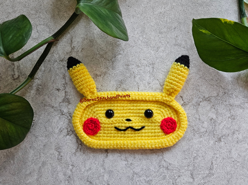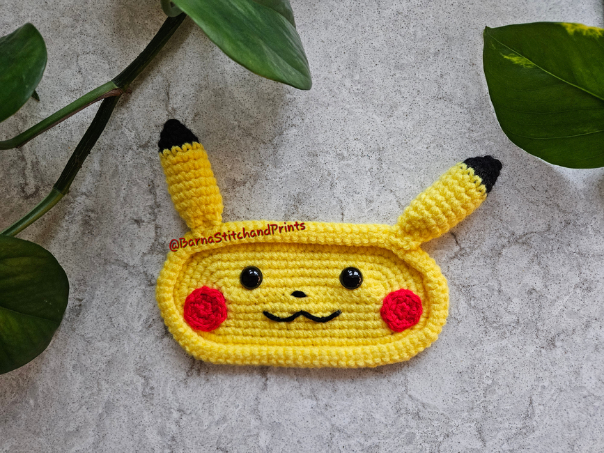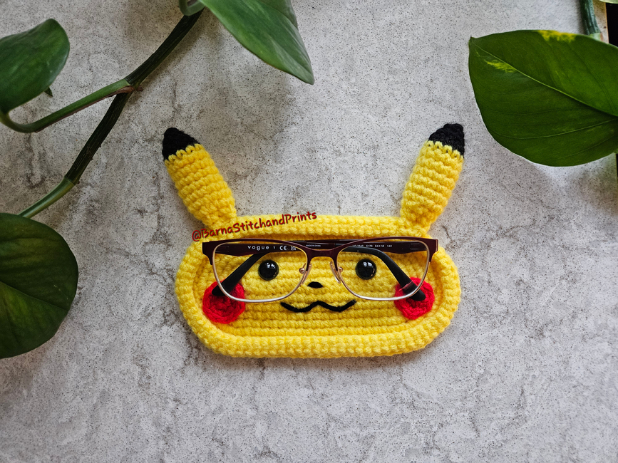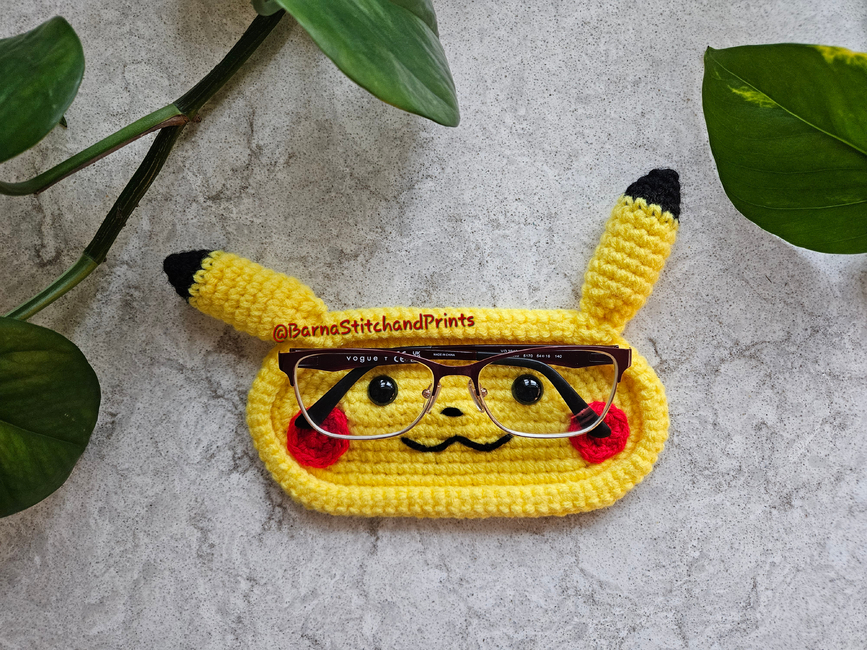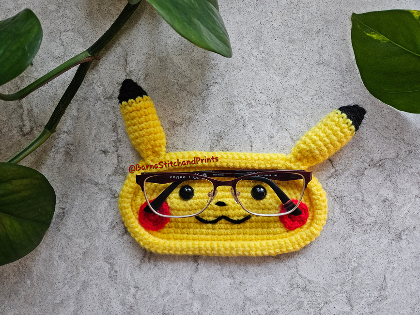 Use this pattern to crochet yourself an adorable Pikachu to rest your glasses in! It's a fun decoration to add to your nightstand or to help your child have a designated place for their glasses when not in use! It's also perfect as a gift for your Pokémon loving friends and family. You can also store jewelry, pens and pencils, or other small items in it. This pattern uses 3 colors of worsted weight yarn (two of which are minimal amounts), safety eyes, and a small amount of stuffing.
