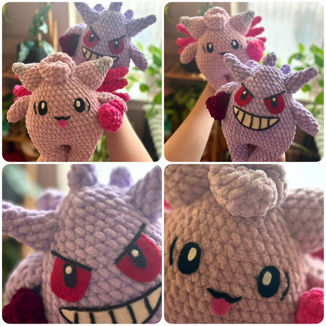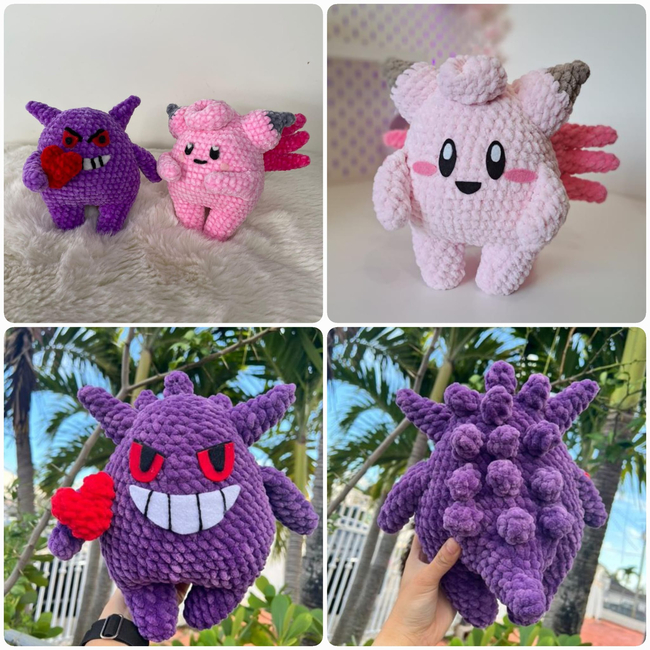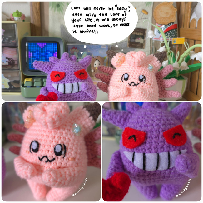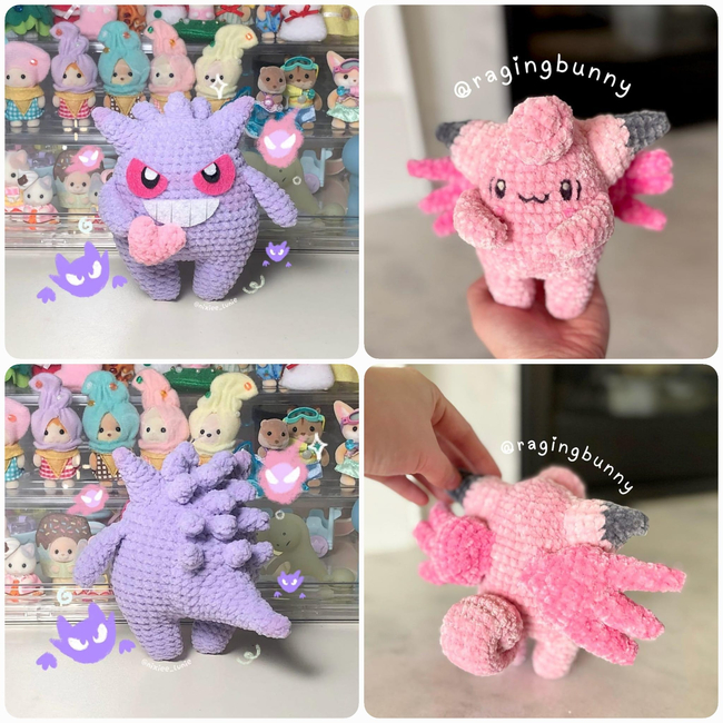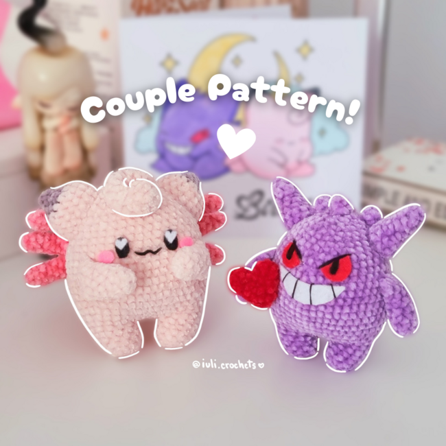 Hi! Welcome to the Pink & Purple Monster Couple Pattern, featuring the 2 monsters inspired by the well known Pokemon, Clefairy and Gengar. The two couldn't have met under normal circumstances, but fate has brought them together and they couldn't be separated ever again. These cuties are the second Pattern from my first Valentine's day collection and they have a special place in my heart!