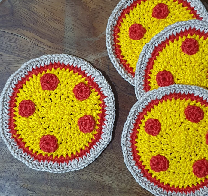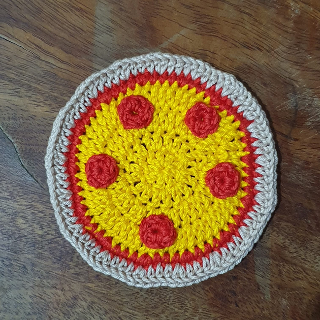 Crochet pizza coaster pattern: Create fun and useful pieces for your home! Ideal for gifting or decorating. Easy to follow and perfect for beginners.