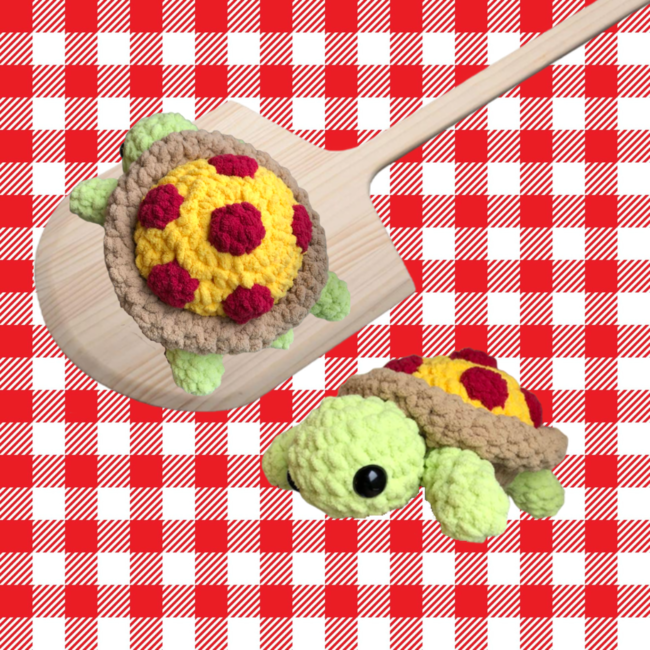 This adorable little turtle has a pizza shell! The pattern provides options for 3 toppings: pepperoni, ham, and pineapple.