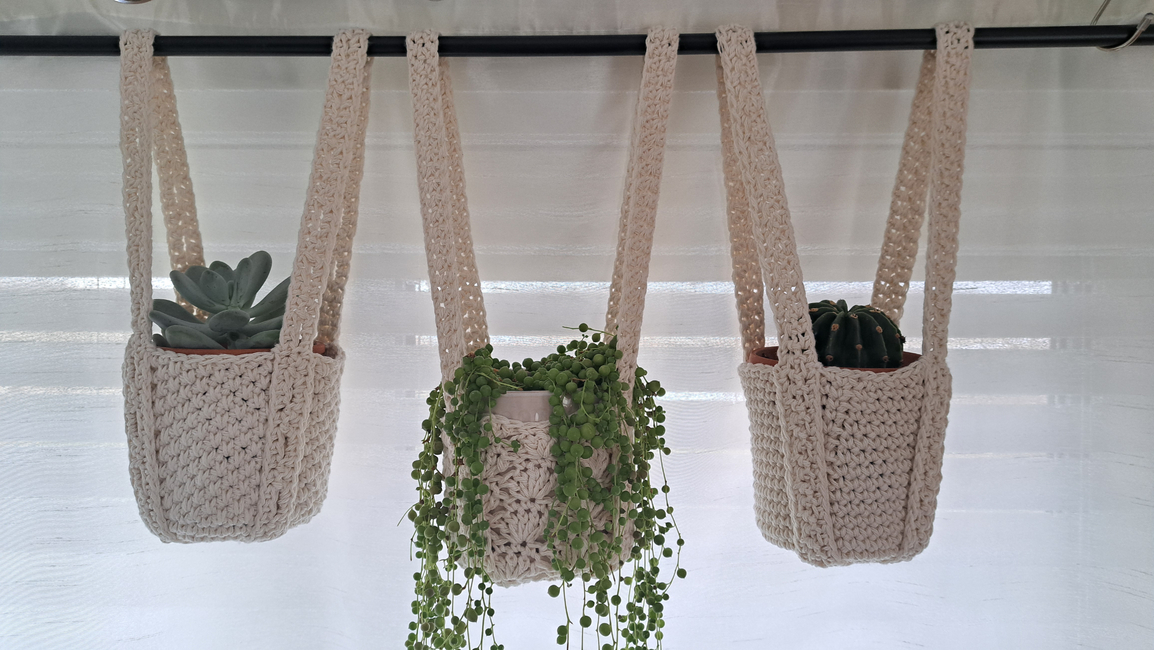 This is a crochet pattern for an adorable trio of plant hangers made from cotton yarn. Full video tutorial included.