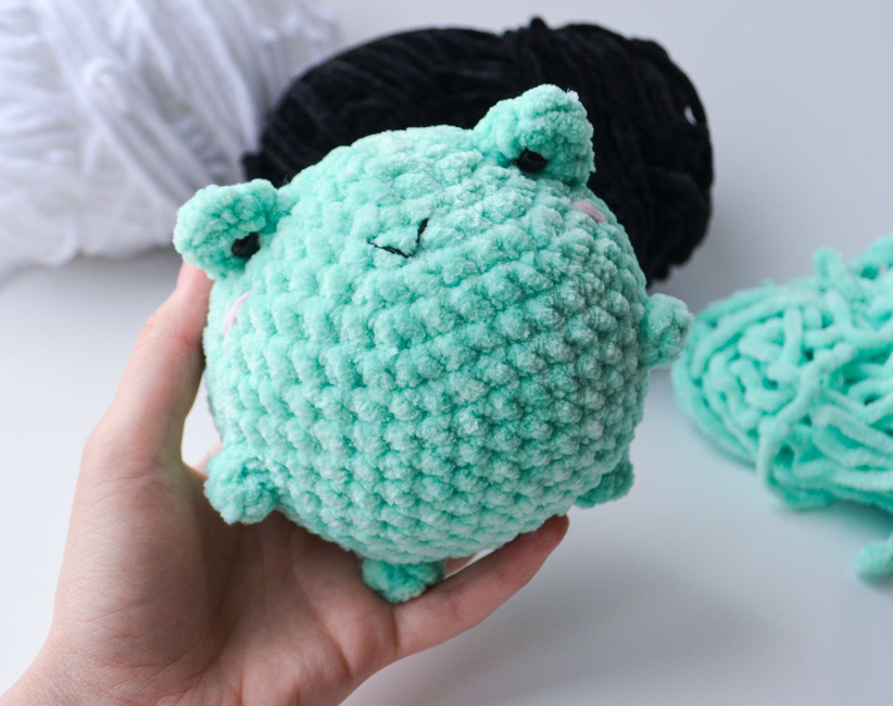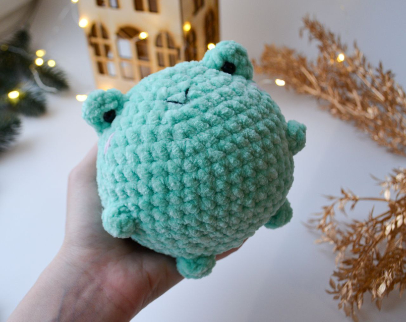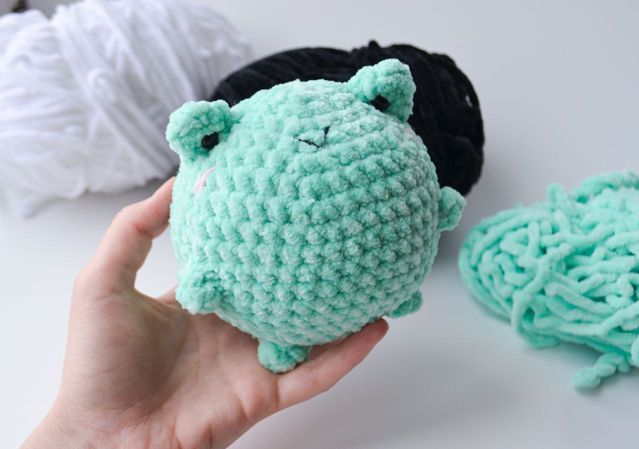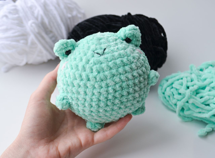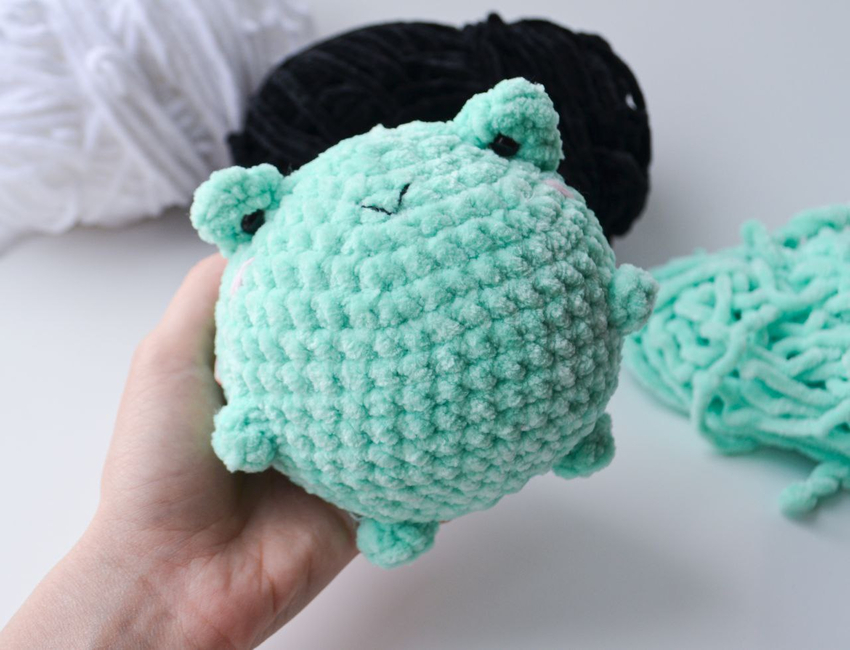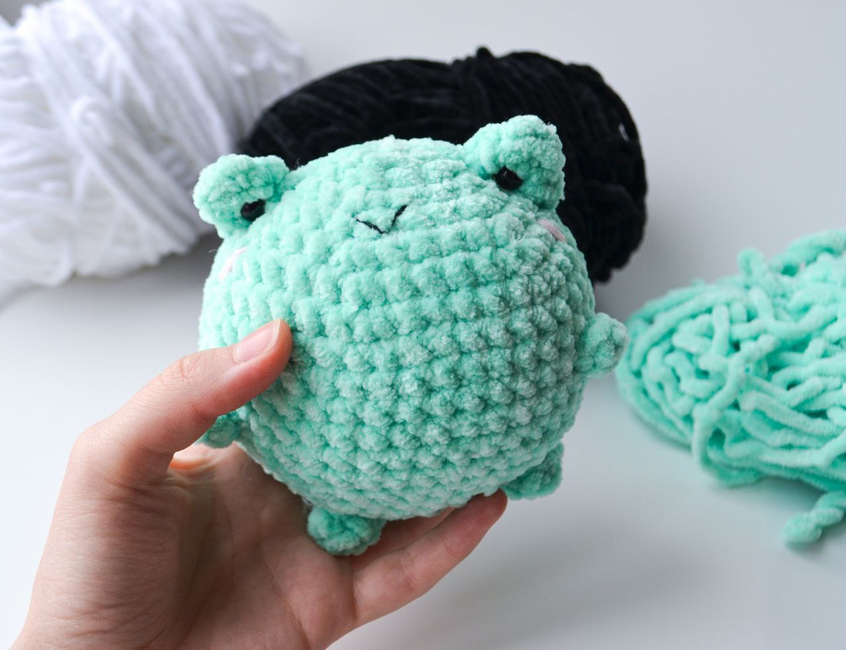 For the frog you can use Super Bulky yarn, such as Wolans Bunny Baby or YarnArt Chenille. You also will need such materials as 8 mm plastic eyes (for gluing), moment glue and a bit of pink and black fine yarn.