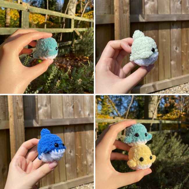 This pattern makes both whales and sharks. The whale pattern is no-sew and the shark only needs sewing for one piece (the dorsal fin).