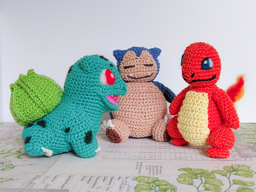 Hi!^^ This bundle contains Bulbasaur, Snorlax, and Charmander! ^^ I hope you'll enjoy making them. Each pattern includes photos and an appendix with helpful sewing video tutorials and more! ^^