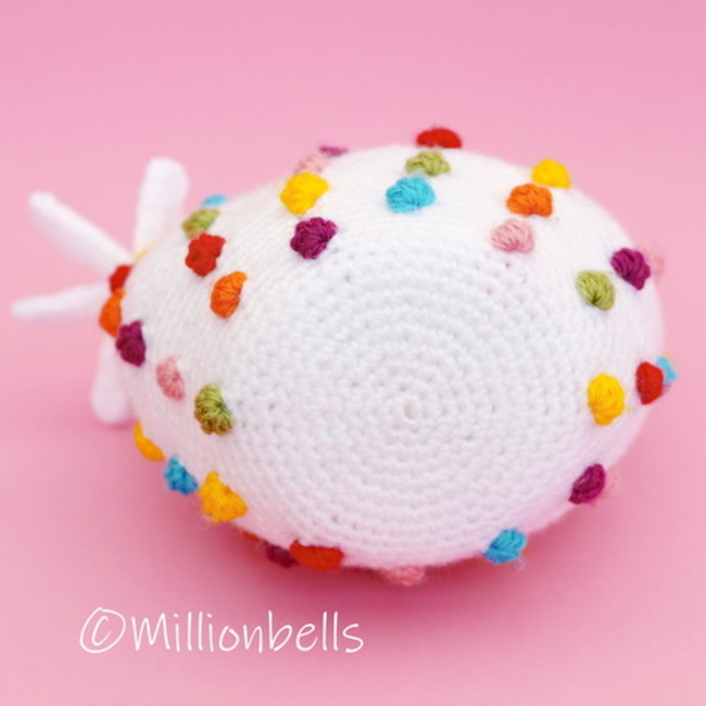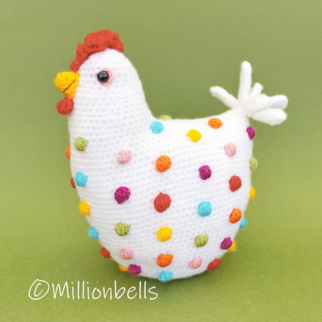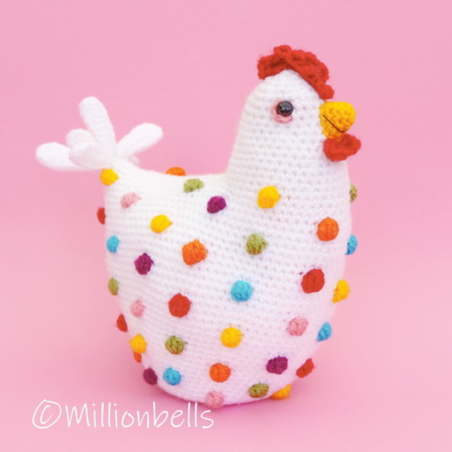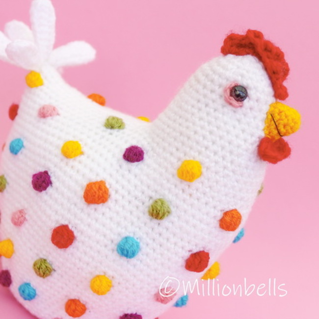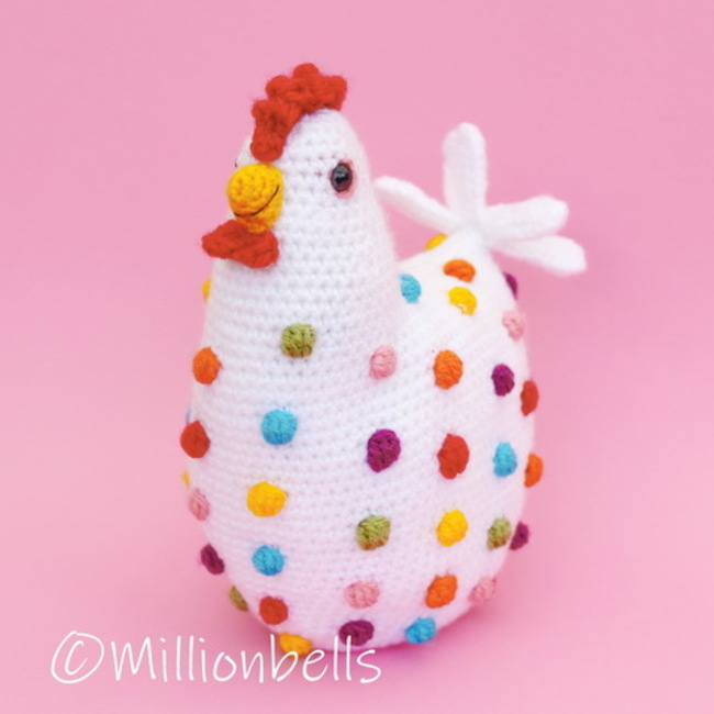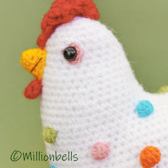 This pattern describes how to crochet a sweet amigurumi chicken with colorful Polka Dots as shown in pictures. The pattern is worked in continuous rounds.