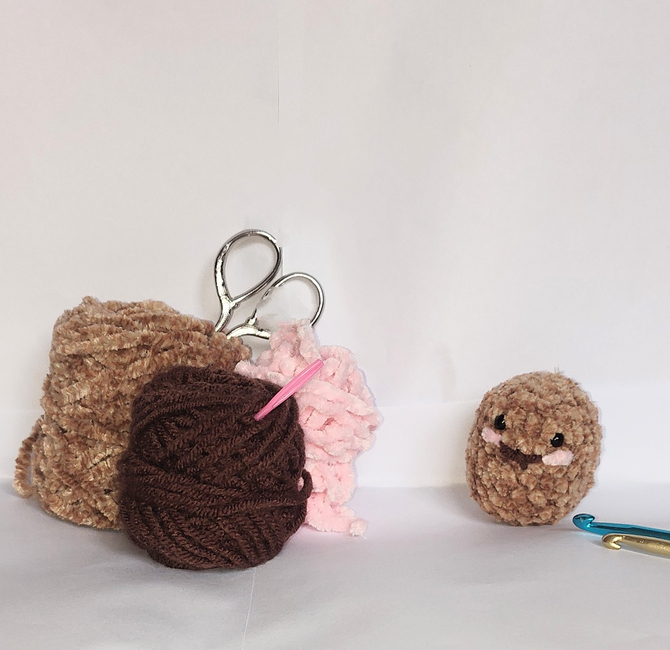 To make Potato you will need: Light pink yarn, Brown, Darker brown, Stitch marker, Fiber fill, Safety eyes. Tools required: 3.75 mm hook, Tapestry needle.