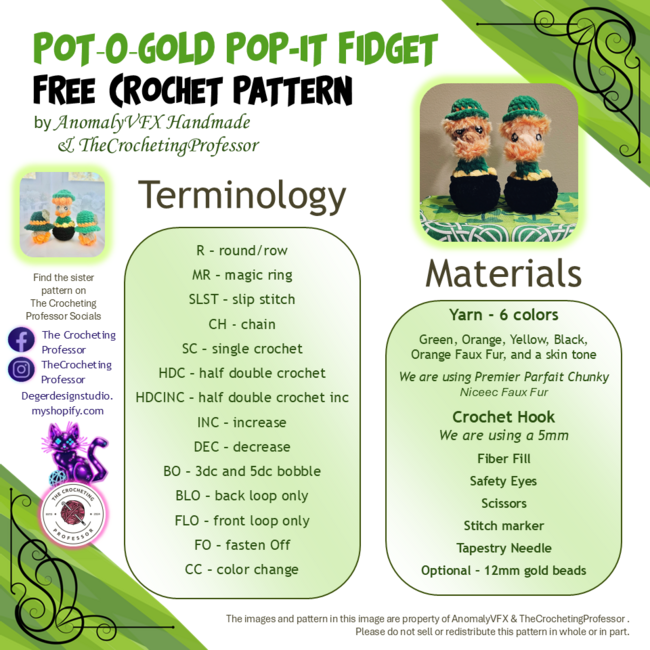 Pot'O'Gold Pop it Fidget is a Beginner Crochet pattern designed by Quirky Anomalies for making an Amigurumi. Crochet your own Leprechaun and his Pot'O'Gold with this free crochet pattern! A cute tactile make that's great for stress relief, fidgeting, St. Patrick's Day gifts and markets.TerminologyR round/rowMR magic ringSLST slip stitchCH - chainSC ...
