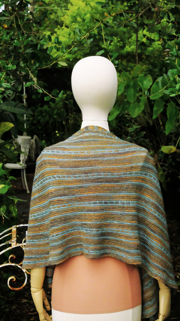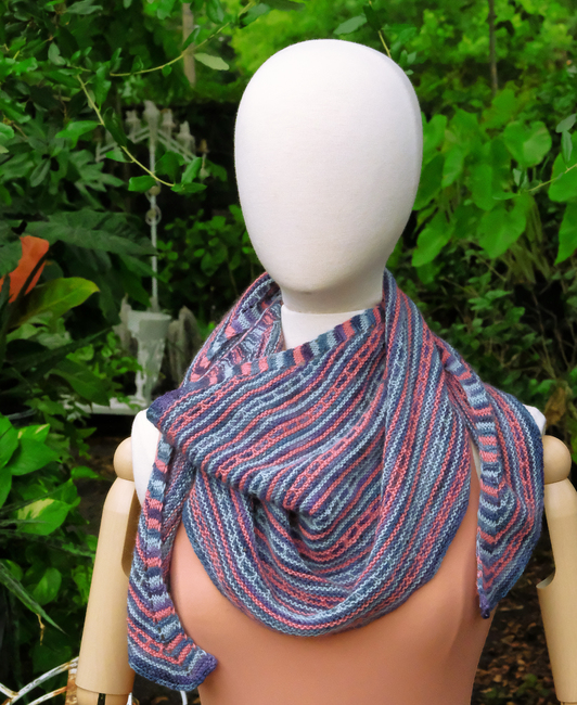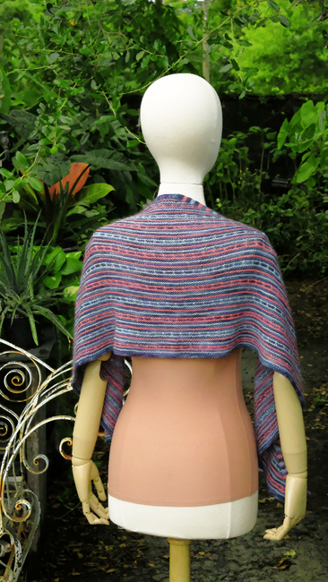 Our Prickly Pear Shawl is crescent shaped that is worked with three colors of fingering or Batiste weight yarn. It starts with a garter tab then proceeds into alternating color garter stitch stripes with slip stitches. This shawl can be worked in a Finger Weight or Sport weight.