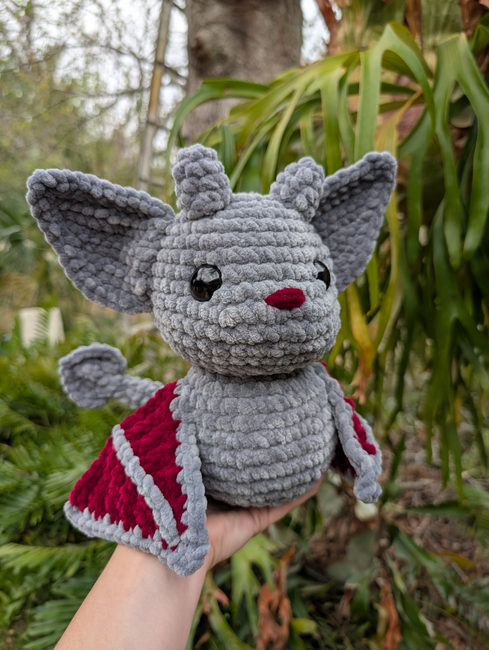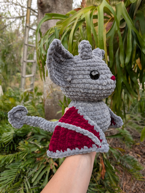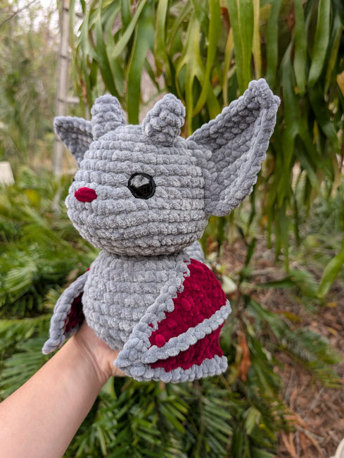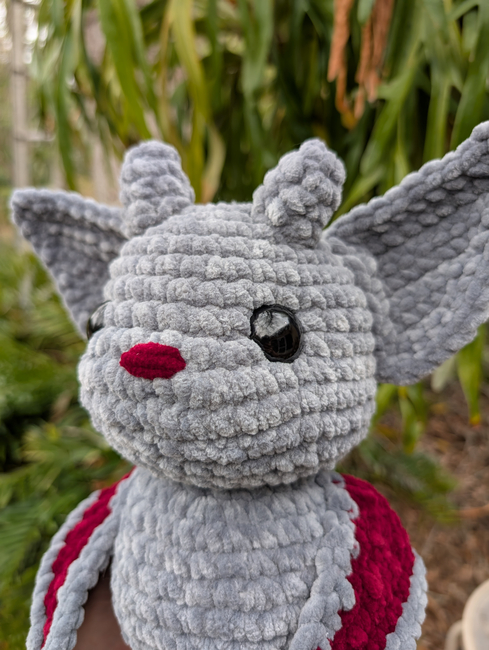 The finished plush will stand about 9" tall (based on my hook and yarn size). I consider this an intermediate pattern due to many pieces that need to be sewn on and various stitch techniques. Altogether this piece will take 3-4 hours.