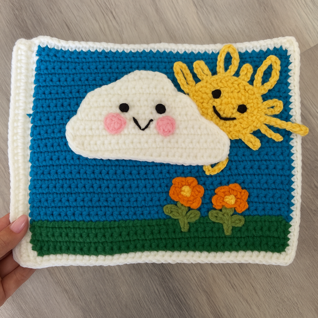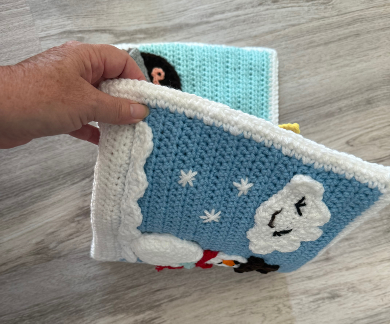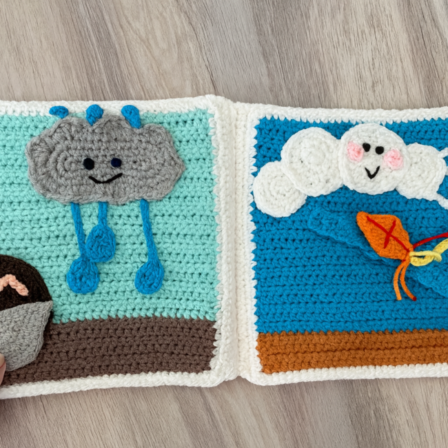 Meet Puffy the Cloud and his cheerful weather friends Breezy, Rainy, and Snowy in this whimsical crochet sensory book designed to delight little hands and curious minds! Each page brings a new weather adventure to life with soft textures, playful details, and interactive elements that encourage imagination and fine motor skills.