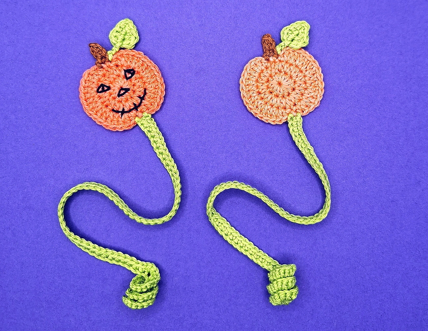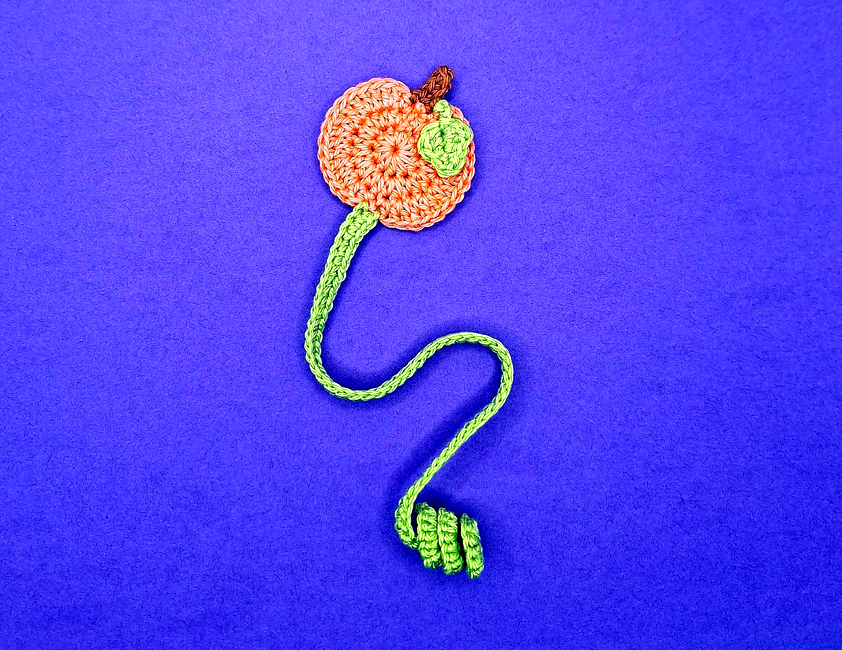 4 ply yarn and 2.5 mm hook gives a pumpkin approximately 2 inches wide, but you can use any yarn with an appropriate size hook for a smaller or larger pumpkin, and the pattern shows you how to easily customise the length of your bookmark to fit any book.