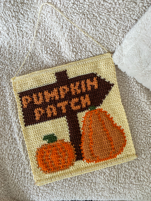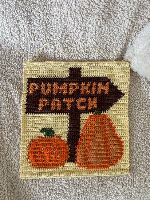 Bring autumn charm into your home with this delightful Pumpkin Patch crochet wall hanging! Featuring a rustic arrow sign, plump pumpkins, and warm fall colors, this tapestry is the perfect seasonal décor for Halloween, Thanksgiving, or anyone who just loves pumpkin spice everything.
