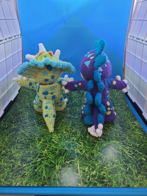 Dark Blue yarn in size 4/worsted (minimal amount for green dino, approx 1/4 skein for Purple dino)